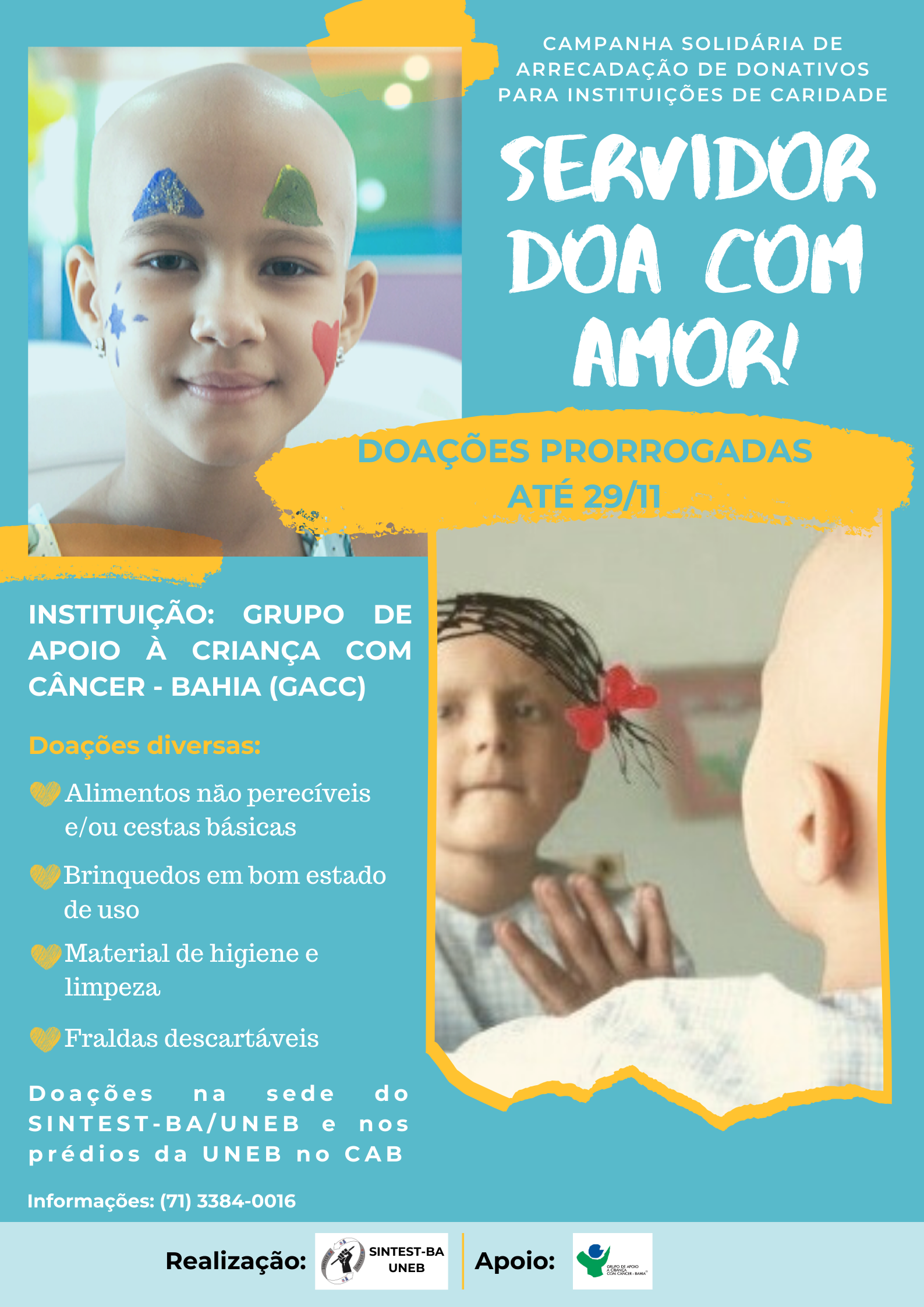 A campanha teve início no dia 23 de setembro, com o objetivo de arrecadar alimentos não perecíveis e/ou cestas básicas, brinquedos em bom estado de uso, material de higiene e limpeza e fraldas descartáveis, a serem doados ao Grupo de Apoio a Crianças com Câncer – Bahia. Os servidores e demais interessados em participar da campanha podem entregar as doações nas caixas coletoras instaladas na sede do SINTEST – Campus -I, Cabula, ou nos prédios da UNEB no CAB.