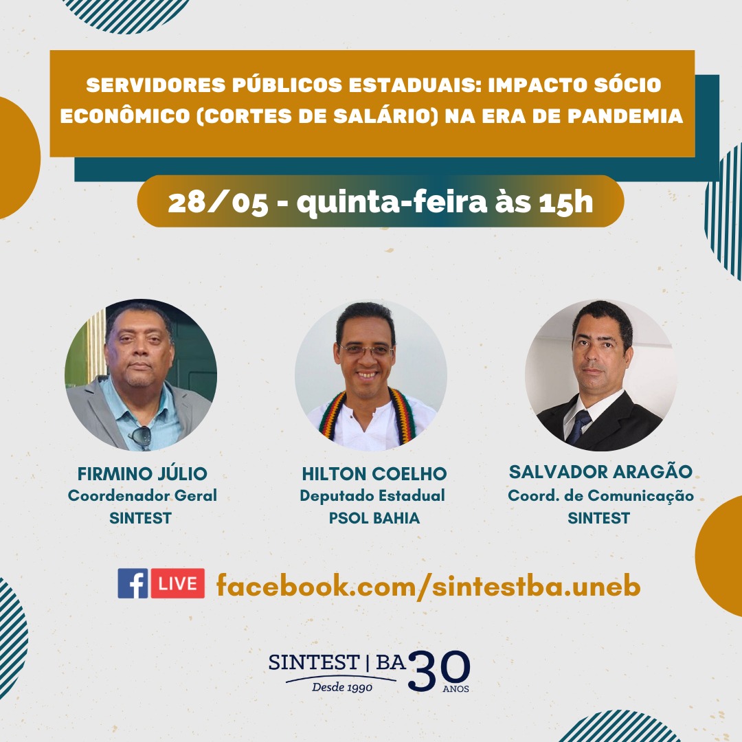 Com transmissão pelo Facebook do SINTEST, a Live desta semana reúne o deputado estadual Hilton Coelho (PSOL), os coordenadores do SINTEST/BA-UNEB, Firmino Júlio e Salvador Aragão, e o presidente da AFUSC-Sindicato, Rafael Bertoldo.