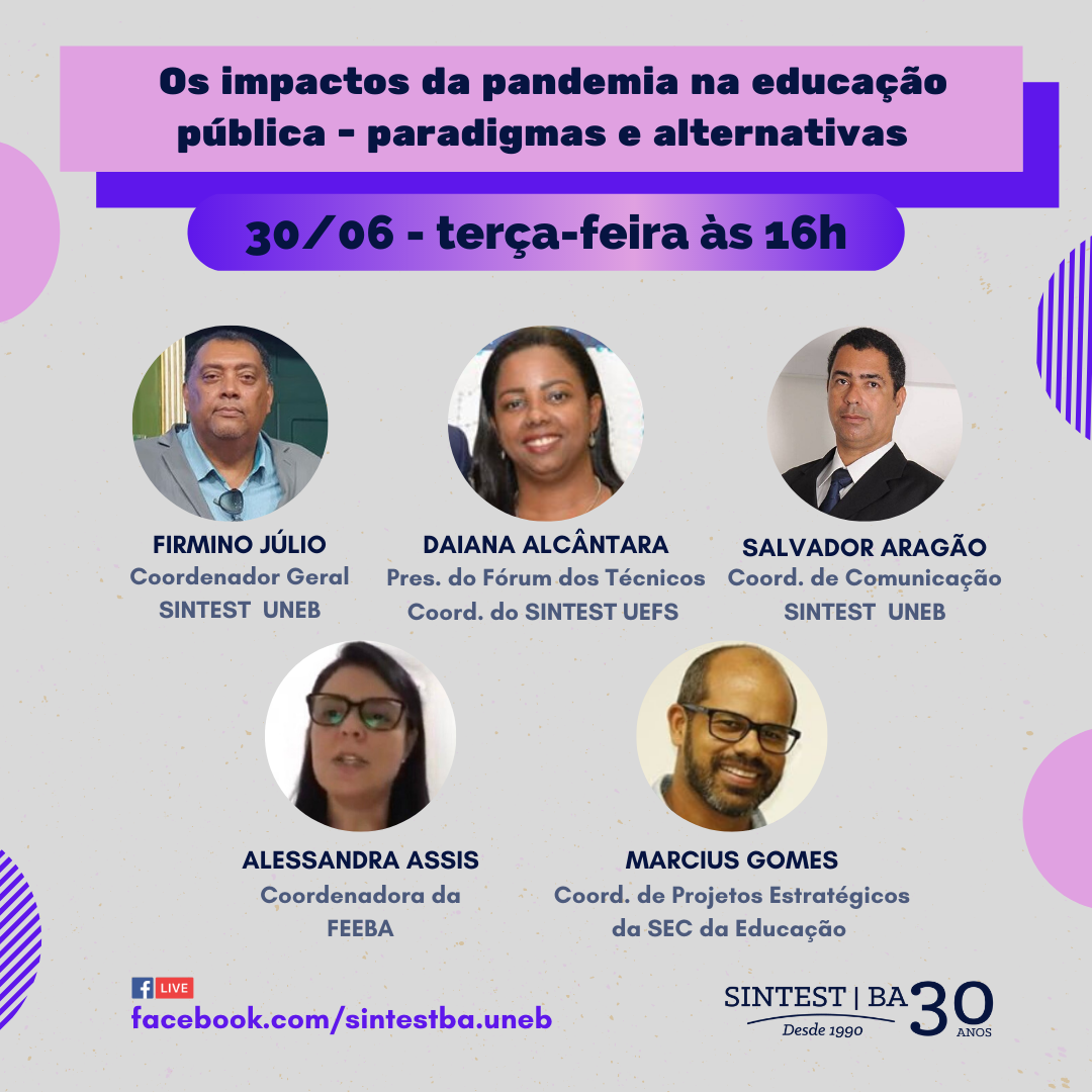 Com transmissão pelo Facebook do SINTEST, a Live desta semana reúne Marcius Gomes, coordenador executivo de projetos estratégicos da secretaria da Educação, Alessandra Assis, coordenadora da FEEBA, os coordenadores do SINTEST UNEB, Firmino Júlio e Salvador Aragão, e a presidente do Fórum dos Técnicos das UEBA, Daiana Alcântara.