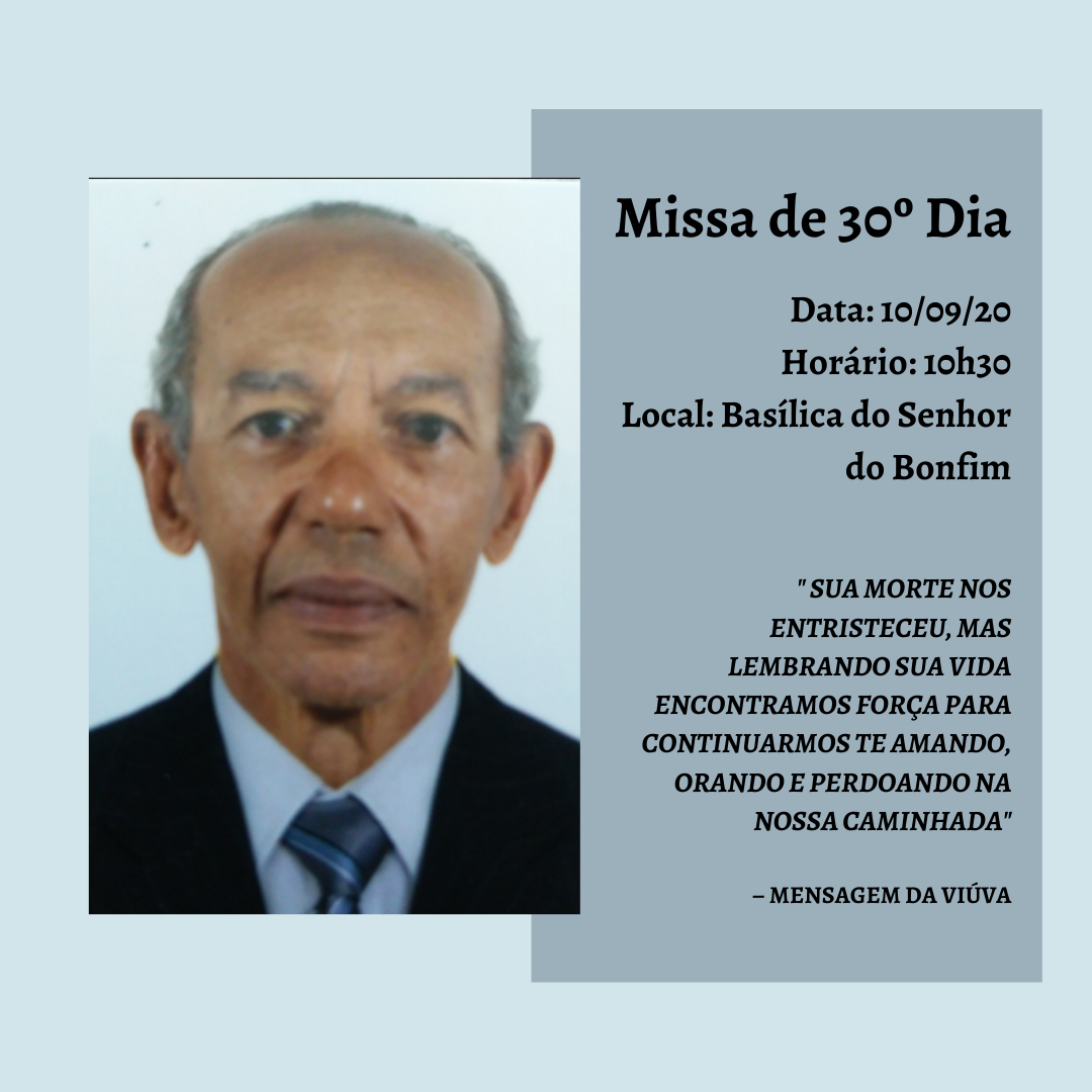 A Sr.ª Graça, viúva do ex–servidor Raimundo Ribeiro Soares, convida a todos para a missa de 30º dia do seu falecimento, que será realizada na Basílica do Senhor do Bonfim, no dia 10/09/2020 às 10h30.