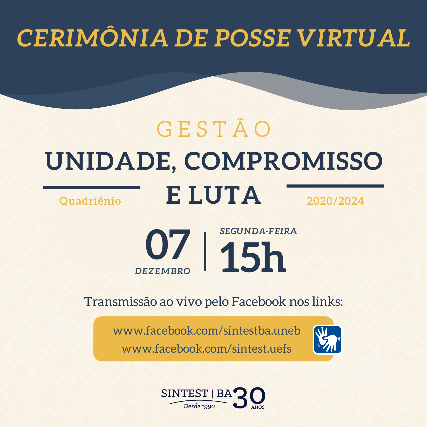 O SINTEST/BA convida os/as filiados/as a participarem desse momento. Para acompanhar a transmissão da posse em tempo real, clique em https://www.facebook.com/sintestba.uneb na segunda-feira, 7 de dezembro, às 15h.