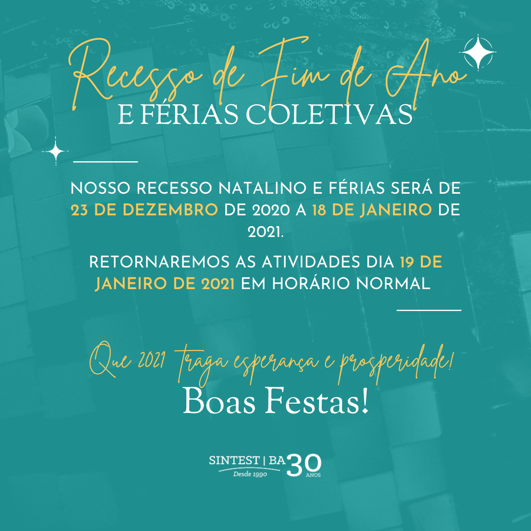 O SINTEST UNEB comunica aos filiados que em razão das festividades de final de ano, entrará em recesso a partir do dia 23 de dezembro (quarta-feira) até 01 de janeiro de 2021, iniciando logo após, um período de férias coletivas que vai de 04 a 18 de janeiro de 2021. Retornaremos às nossas atividades no dia 19/01/2021.