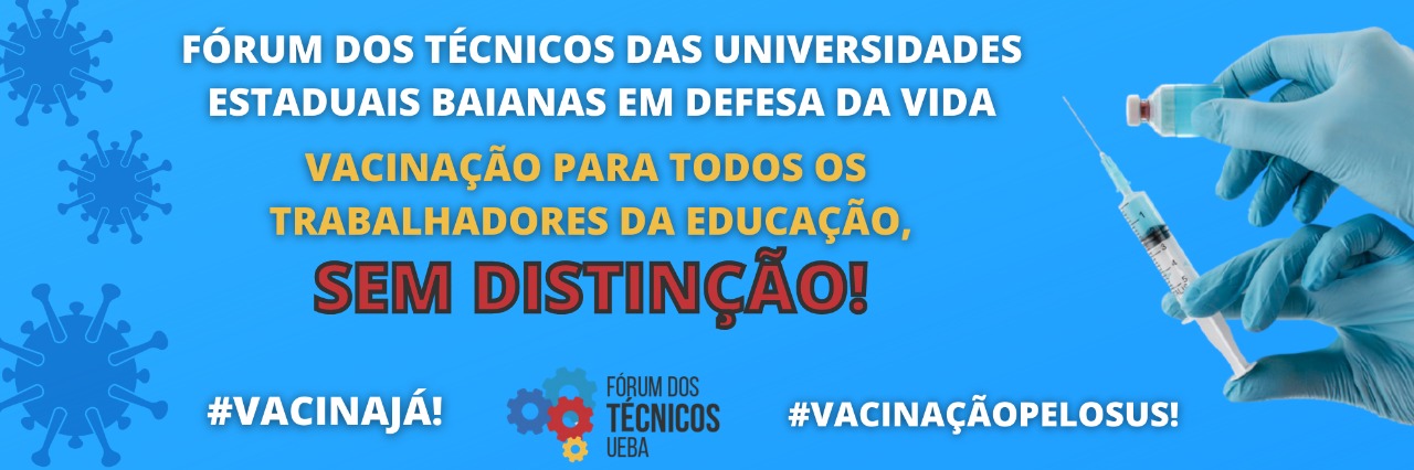 O SINTEST/BA vem procurando garantir que a categoria e todos os profissionais da educação sejam imunizados, e junto com o Fórum dos Técnicos das UEBA inicia campanha em defesa da vacinação dos trabalhadores da educação, sem distinção entre ensino básico, superior e cargos ocupados, com exposição de outdoors por toda a Bahia. O SINTEST/BA UNEB escolheu as cidades de Paulo Afonso, Juazeiro, Serrinha e Santo Antônio de Jesus para receber o outdoor da campanha, Feira de Santana foi a escolhida pelo SINTEST/BA UEFS, Ilhéus pela Afusc e Vitória da Conquista pela Afus.