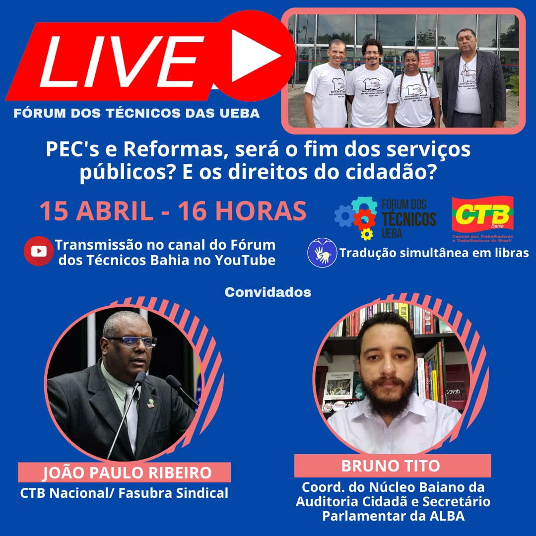 Para debater a temática o Fórum dos Técnicos convidou: João Paulo Ribeiro (CTB Nacional/ Fasubra Sindical) e Bruno Tito (Coordenador do Núcleo Baiano da Auditoria Cidadã e Secretário Parlamentar da ALBA).