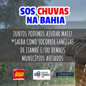 O Sindicalismo Socialista Brasileiro (SSB), o Fórum dos Técnicos das Universidades do Estado da Bahia (UEBA) e o Sindicato dos Servidores Públicos Municipais de Salvador (Sindseps) se uniram para ajudar baianos(as) prejudicados pelas recorrentes chuvas que assolam diversos municípios. Juntas, as entidades sindicais estão arrecadando recursos para aquisição de itens de primeira necessidade, a fim de mitigar danos e ajudar os que mais sofrem com essa situação. Interessados(as) em colaborar podem fazer um depósito ou transferência para o Bradesco (Agência: 3673/CC: 842-7/CNPJ do SINTEST-BA:34.281.725/0001-17), e precisamos que nos envie o comprovante. Doações em alimentos, agasalhos, produtos de limpeza, materiais de higiene, água mineral, filtros de água e outros itens podem ser entregues nos diversos Grupamentos do Corpo de Bombeiros Militares em todo o Estado.