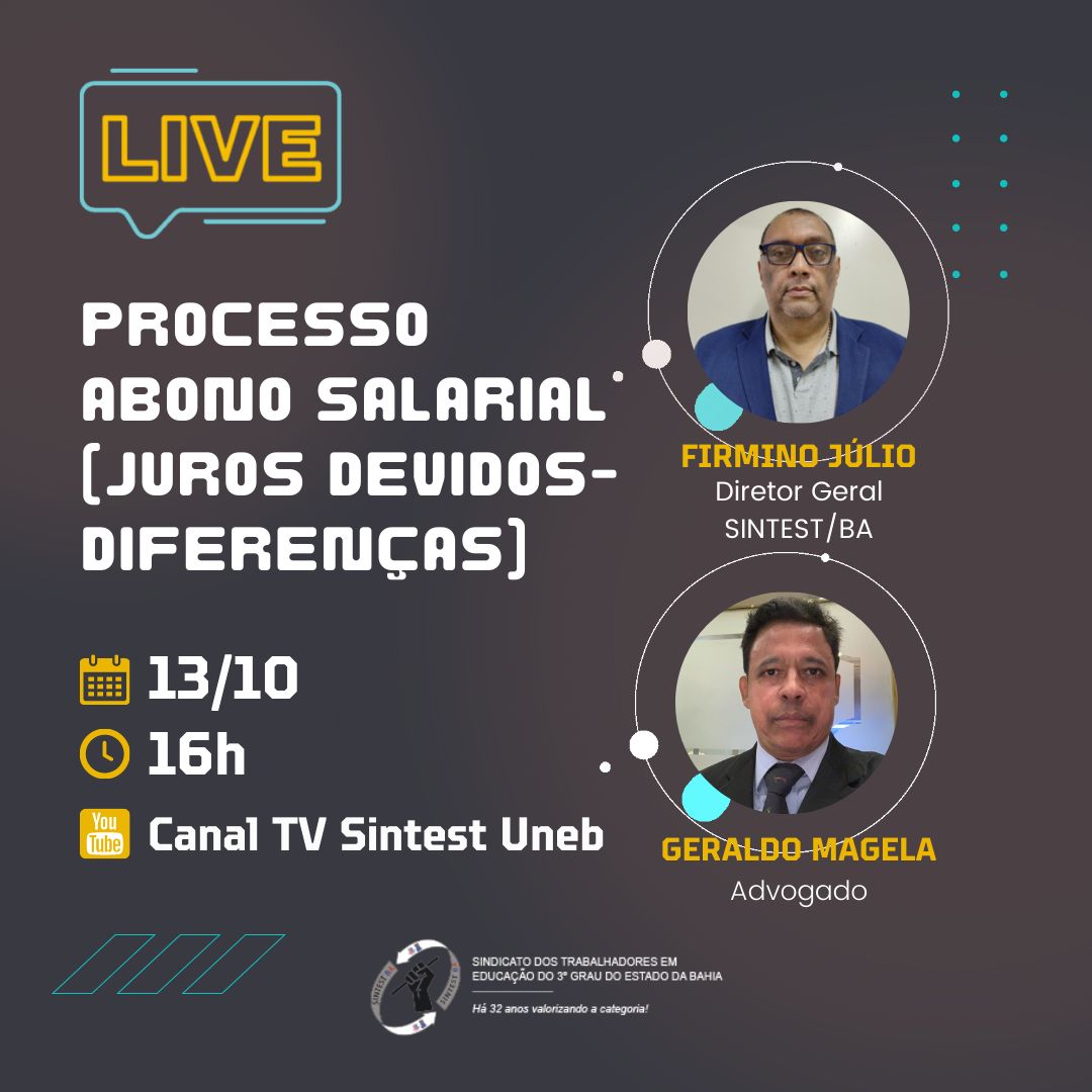 O Sindicato dos Trabalhadores em Educação do Terceiro Grau (SINTEST/BA UNEB) e o escritório de Geraldo Magela realizarão no dia 13 de outubro às 16h, uma transmissão ao vivo para tratar dos juros devidos e diferenças do processo de abono salarial.