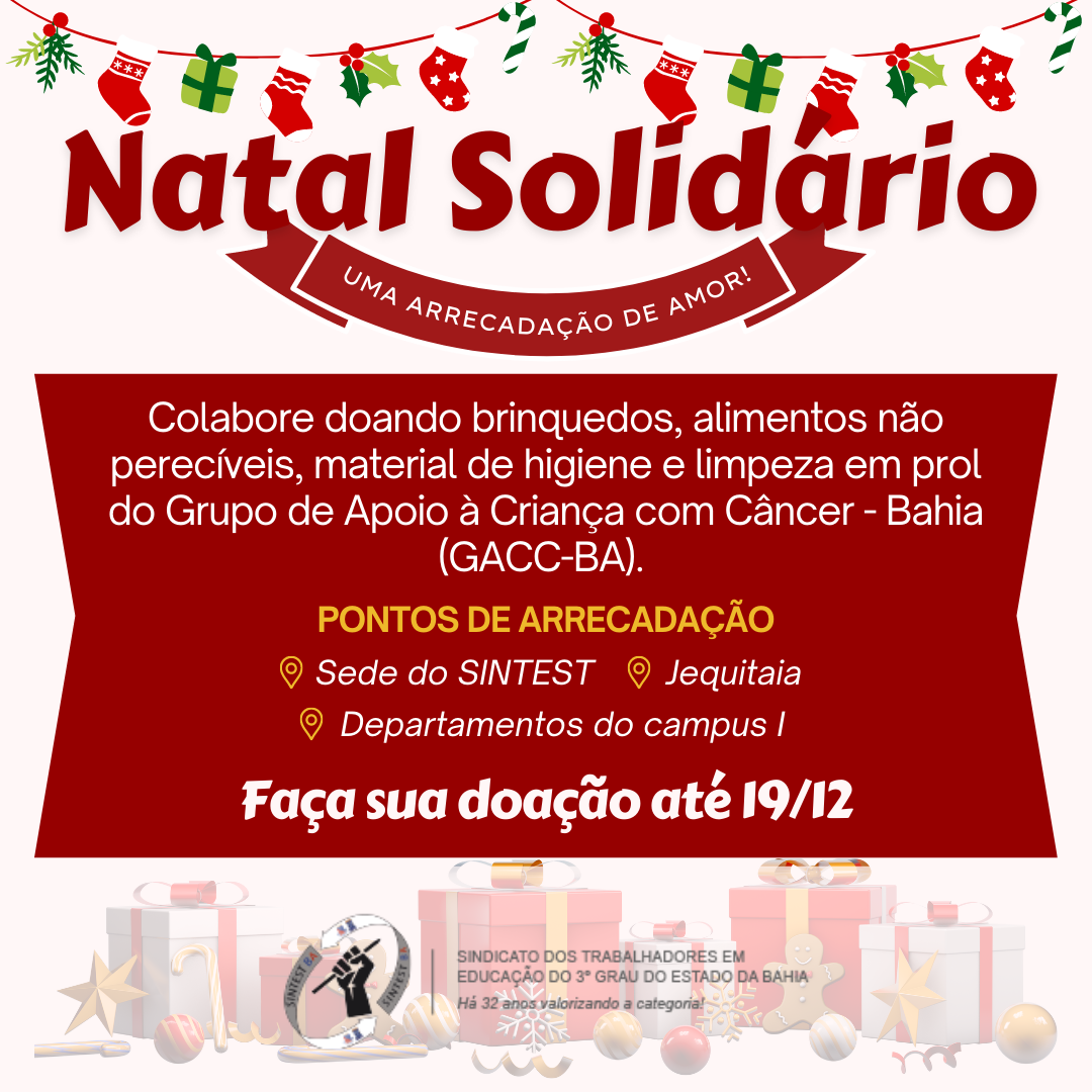 As celebrações de fim de ano costumam ser também um momento de solidariedade e de cuidados com quem mais precisa. Pensando nisso, o SINTEST arrecada pelo 3º ano consecutivo brinquedos, alimentos não perecíveis e materiais de higiene pessoal e limpeza em prol do Grupo de Apoio à Criança com Câncer – Bahia (GACC-BA), na campanha Natal Solidário 2022.