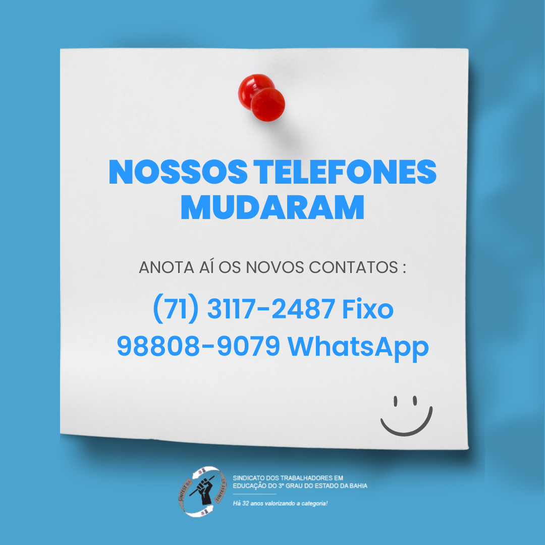 O SINTEST atende por novos números de telefones. Para contato com o sindicato, o(a) servidor(a) precisa ligar agora para (71) 3117-2487 – fixo ou 98808-9079 – celular e whatsApp.