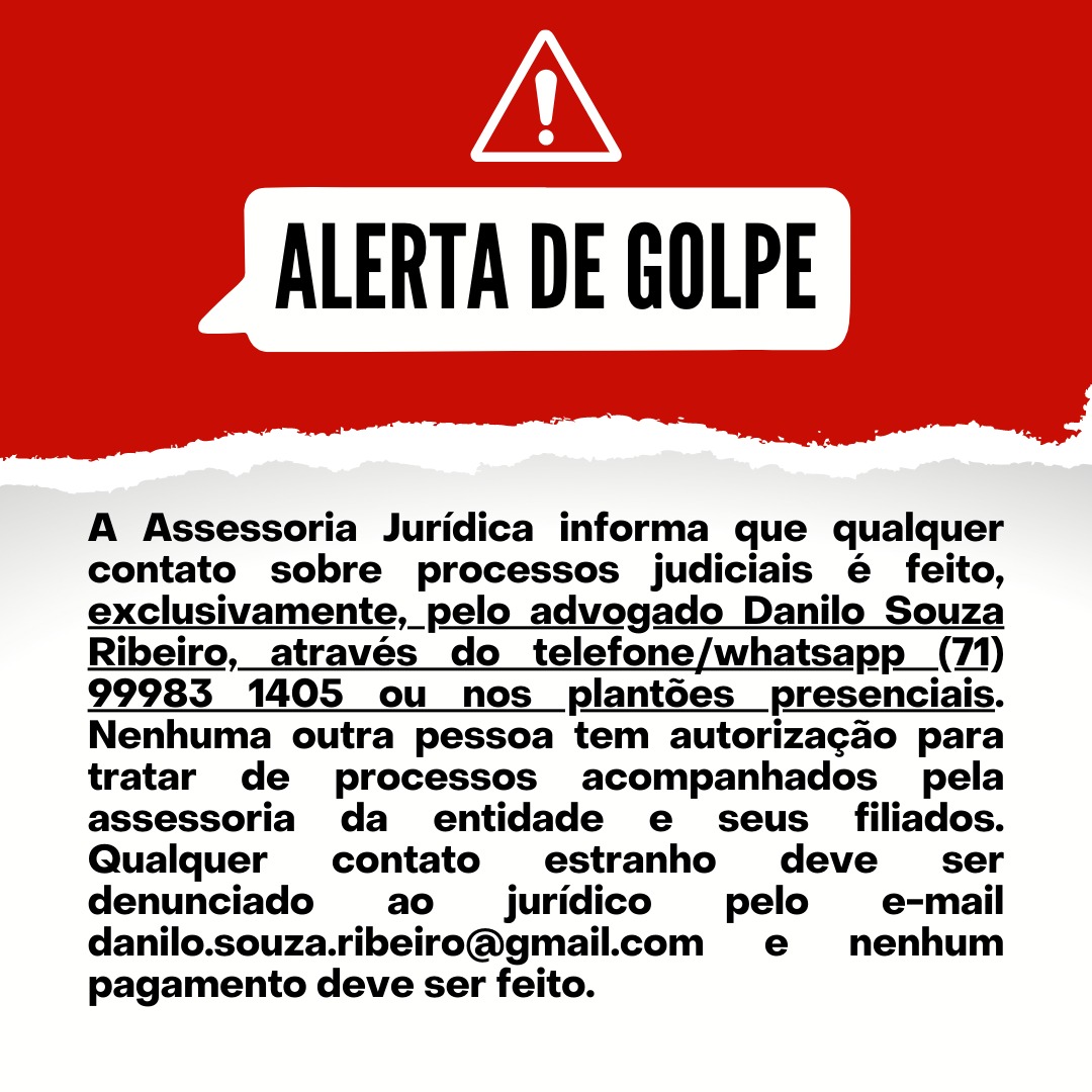 A Assessoria Jurídica informa que qualquer contato sobre processos judiciais é feito, exclusivamente, pelo advogado Danilo Souza Ribeiro, através do telefone/whatsapp (71) 999831405 ou nos plantões presenciais. Nenhuma outra pessoa tem autorização para tratar de processos acompanhados pela assessoria da entidade e seus filiados. Qualquer contato estranho deve ser denunciado ao jurídico pelo e-mail danilo.souza.ribeiro@gmail.com e nenhum pagamento deve ser feito.