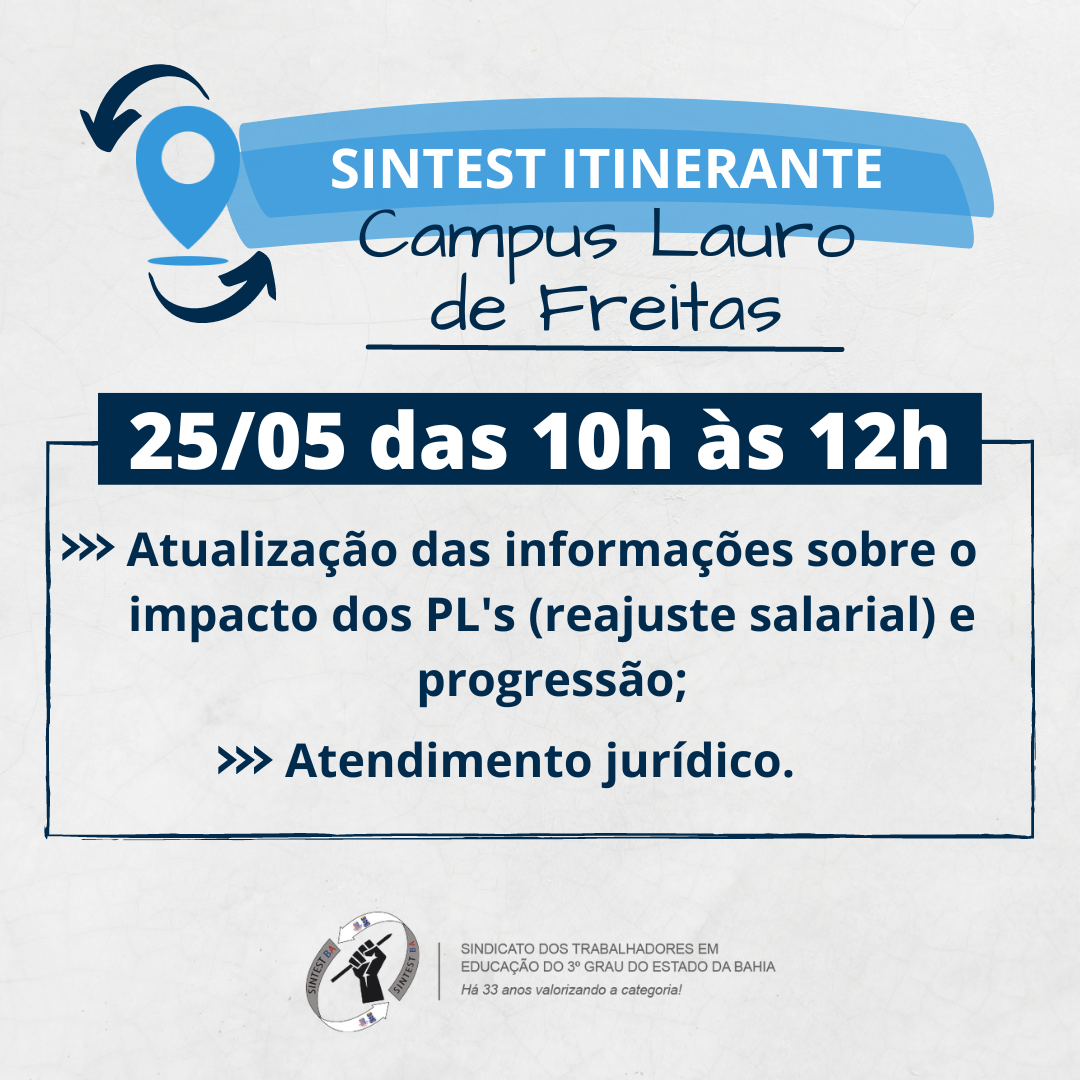Nesta quinta-feira (25) o SINTEST Itinerante estará no campus da UNEB em Lauro de Freitas para conhecer a realidade do campus e discutir com os servidores temas de seu interesse. Na oportunidade, os servidores contarão com atendimento jurídico da entidade. 💬