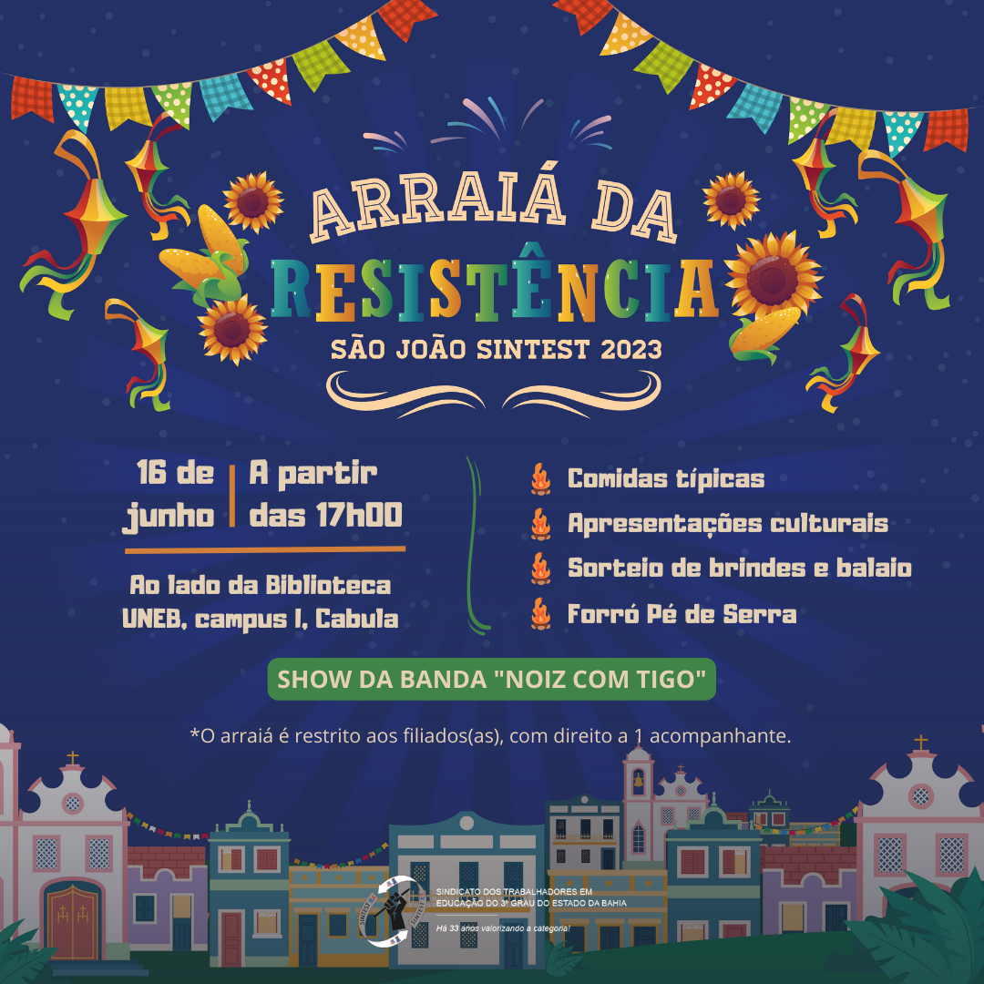 O SINTEST/BA UNEB, convida todos os filiados ao sindicato ativos e aposentados para participarem do “Arraiá da Resistência”, no dia 16 de junho, a partir das 17h, no espaço ao lado da biblioteca da UNEB, no campus I, Cabula.