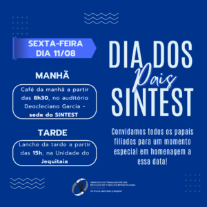 O Sindicato dos Trabalhadores em Educação do Terceiro Grau (SINTEST/BA UNEB) convida todos os filiados pais, para participar de um momento especial em celebração ao dia dos pais. Será realizado na sexta, dia 11 de agosto, às 08:00h, um café da manhã no auditório Deocleciano Garcia (na sede do SINTEST). E às 15:00h, um lanche da tarde na Unidade do Jequitaia.