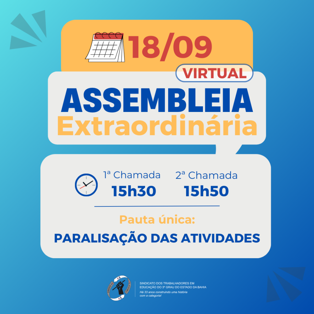 O Sindicato dos Trabalhadores em Educação do Terceiro Grau do Estado da Bahia (SINTEST/BA UNEB) convoca todos/as os/as servidores/as filiados/as para participarem de ASSEMBLEIA EXTRAORDINÁRIA VIRTUAL, hoje (18/09), em primeira chamada às 15h30 e segunda às 15h50, por intermédio do Google Meet.