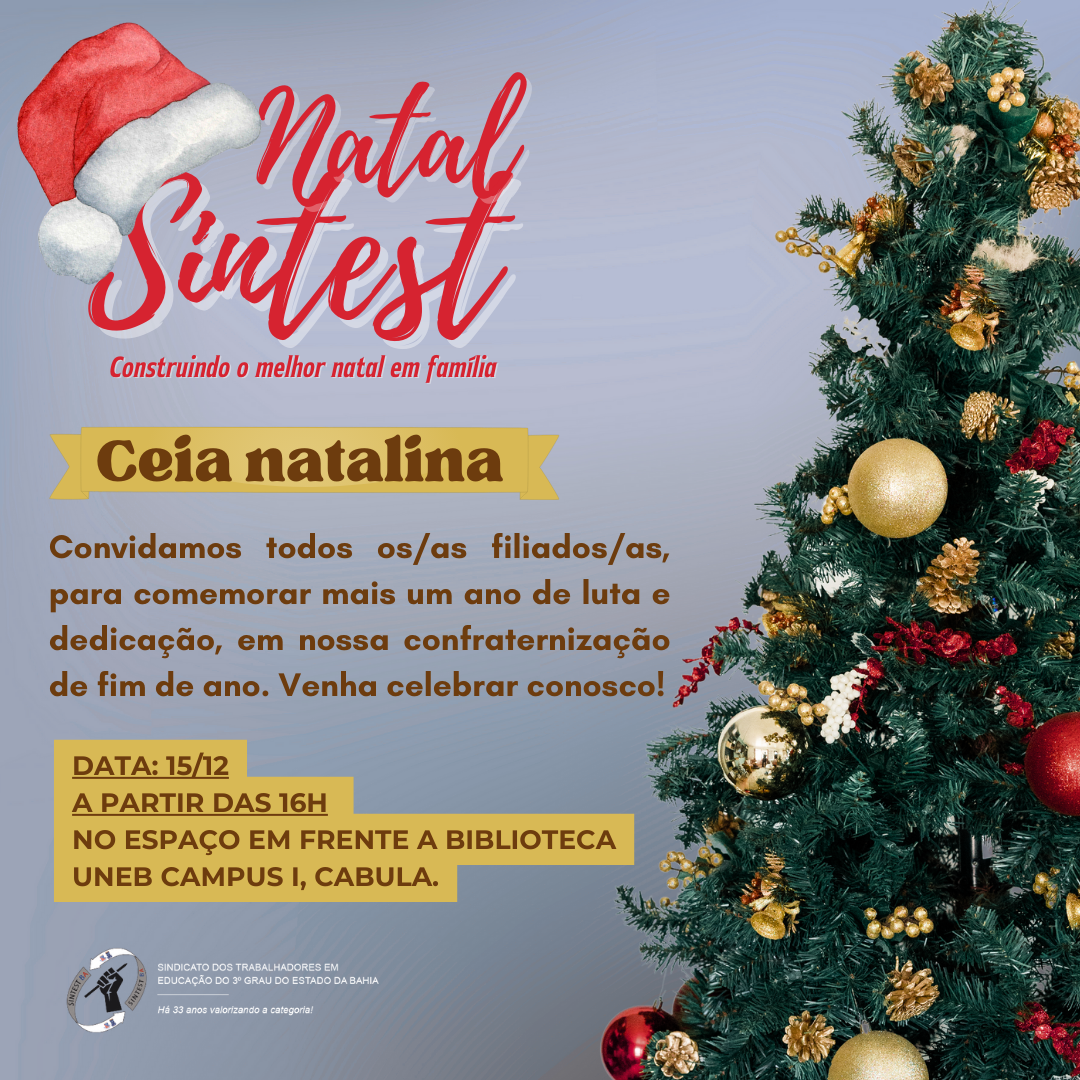 Finda mais um ano de lutas, e é hora de nos encontrarmos para confraternizar. Por isso, convidamos nossos filiados ativos e aposentados para a ceia natalina da entidade, que acontecerá no dia 15 de dezembro a partir das 16 horas, no espaço em frente a biblioteca Central, campus I – Rua Silveira Martins, Cabula.