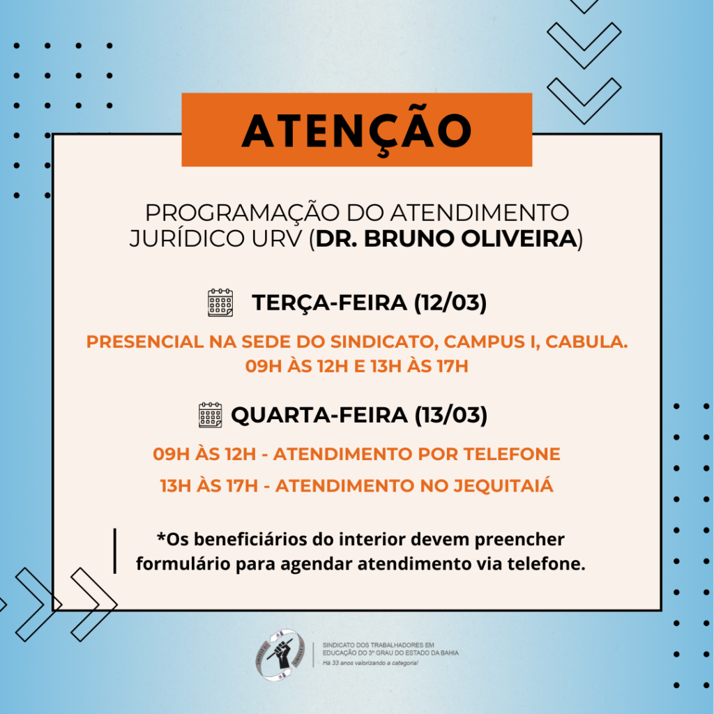 O advogado Bruno Oliveira atenderá presencialmente por ordem de chegada na sede do sindicato e no Jequitaia. Para os beneficiários do interior o atendimento será por telefone, através de agendamento via preenchimento de formulário AQUI.