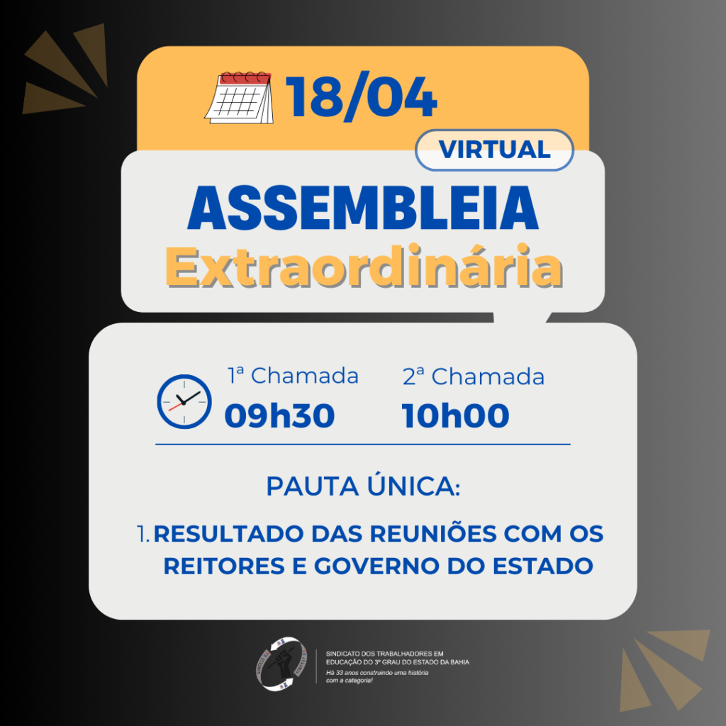 A Direção do SINTEST/BA UNEB convoca seus filiados para uma Assembleia Extraordinária, nesta quinta-feira, 18 de abril, em primeira chamada às 09h30 e segunda chamada às 10h, em formato online, através da plataforma Google Meet. O link de acesso será liberado no site do sindicato às 09h20.