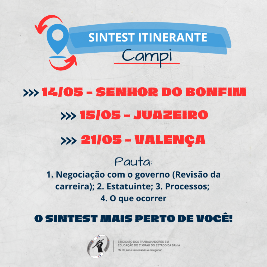 Nos dias 14, 15 e 21 de maio, o SINTEST Itinerante estará visitando os campi de Senhor do Bonfim, Juazeiro e Valença. A diretoria do Sindicato se reunirá com os técnicos administrativos dos departamentos para discutir pontos importantes de nossa luta.