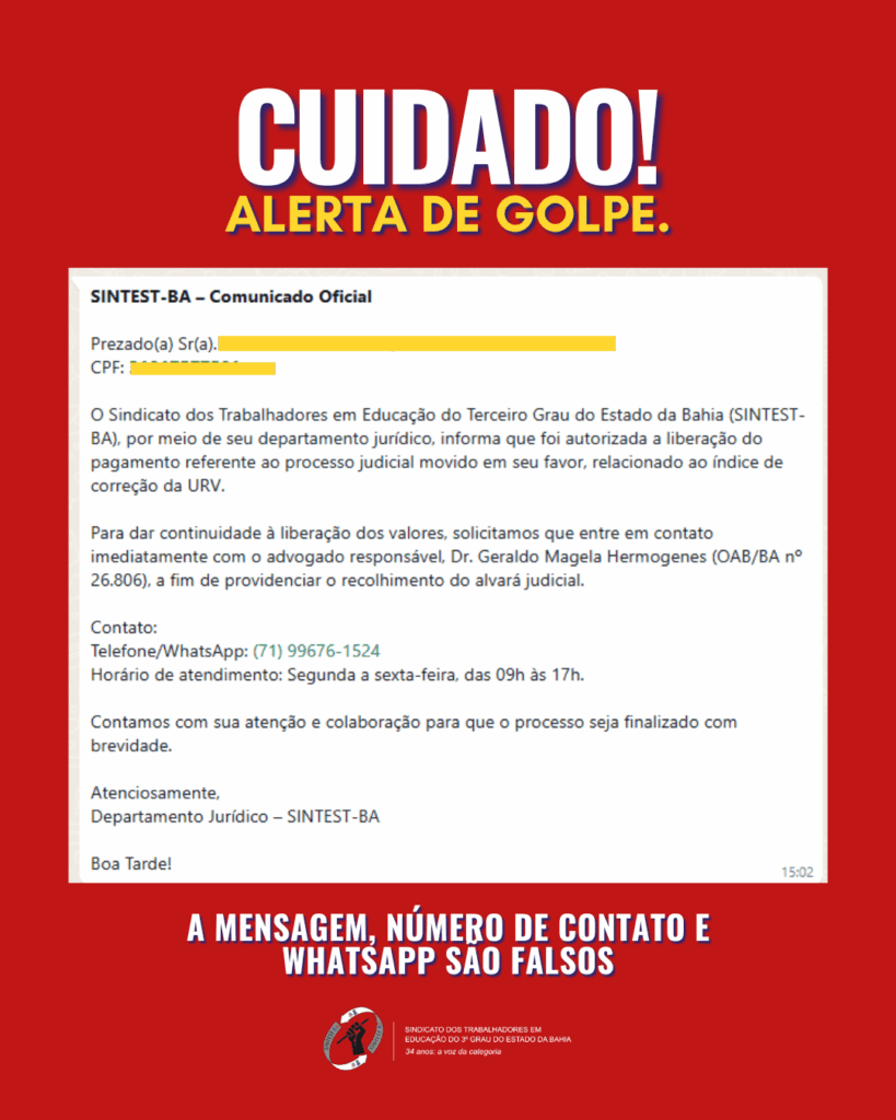 ⚠️ O SINTEST/BA e o Escritório Geraldo Magela Hermógenes NÃO ESTÃO ENVIANDO MENSAGENS e NÃO COBRAM qualquer valor dos beneficiários para a liberação de processos judiciais.
