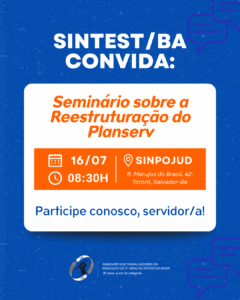 O SINTEST/BA convida todos os servidores e servidoras para o Seminário sobre a Reestruturação do Planserv, que acontecerá amanhã, quarta-feira, 16 de julho, às 8h30, na sede do SINPOJUD (Rua Marujos do Brasil, 42 – Tororó, Salvador-BA).